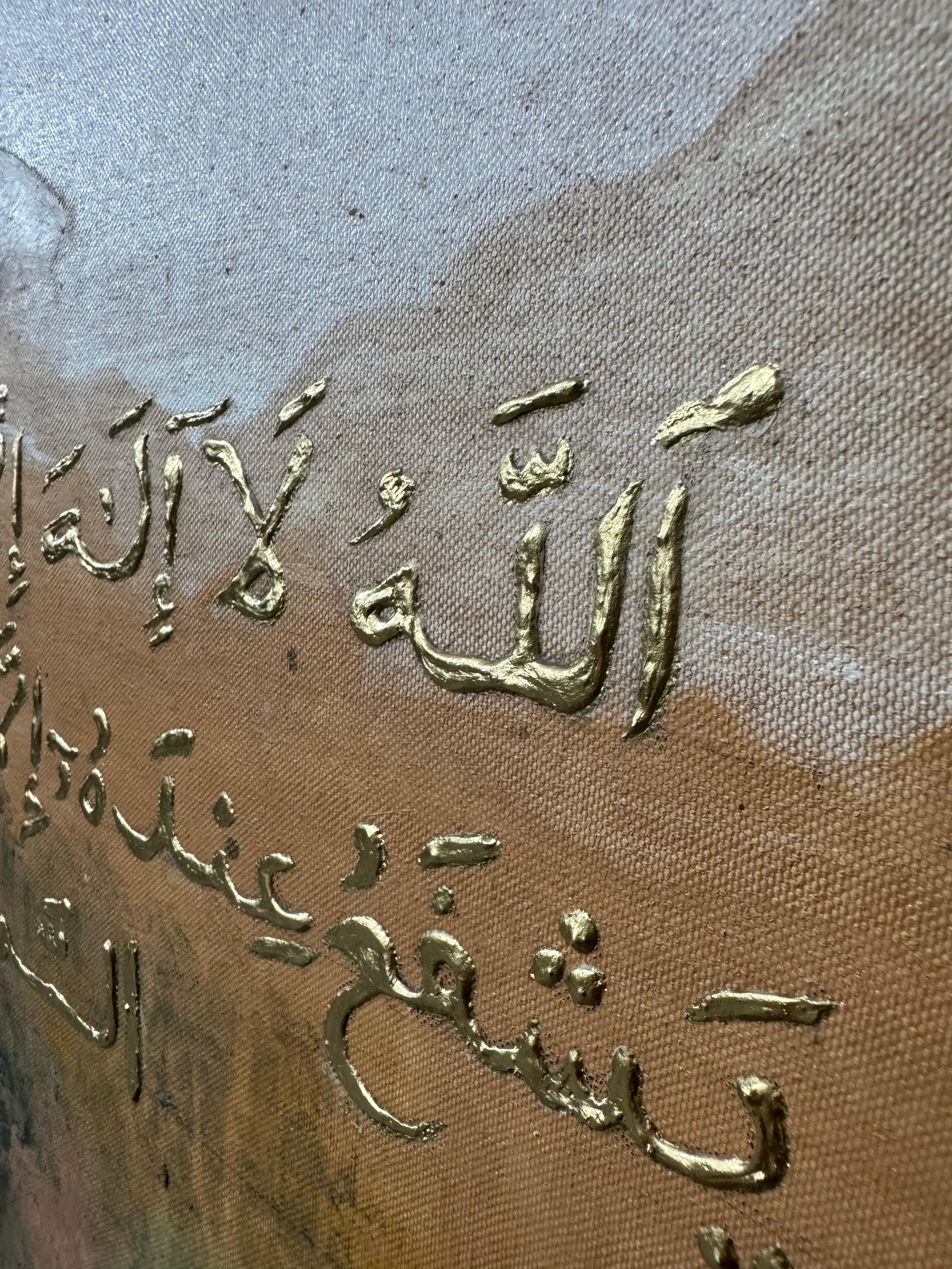 Au centre du tableau, la calligraphie de l’Ayat Al-Kursi est exécutée en doré avec effet 3D, apportant une dimension spirituelle forte et une touche de prestige unique.