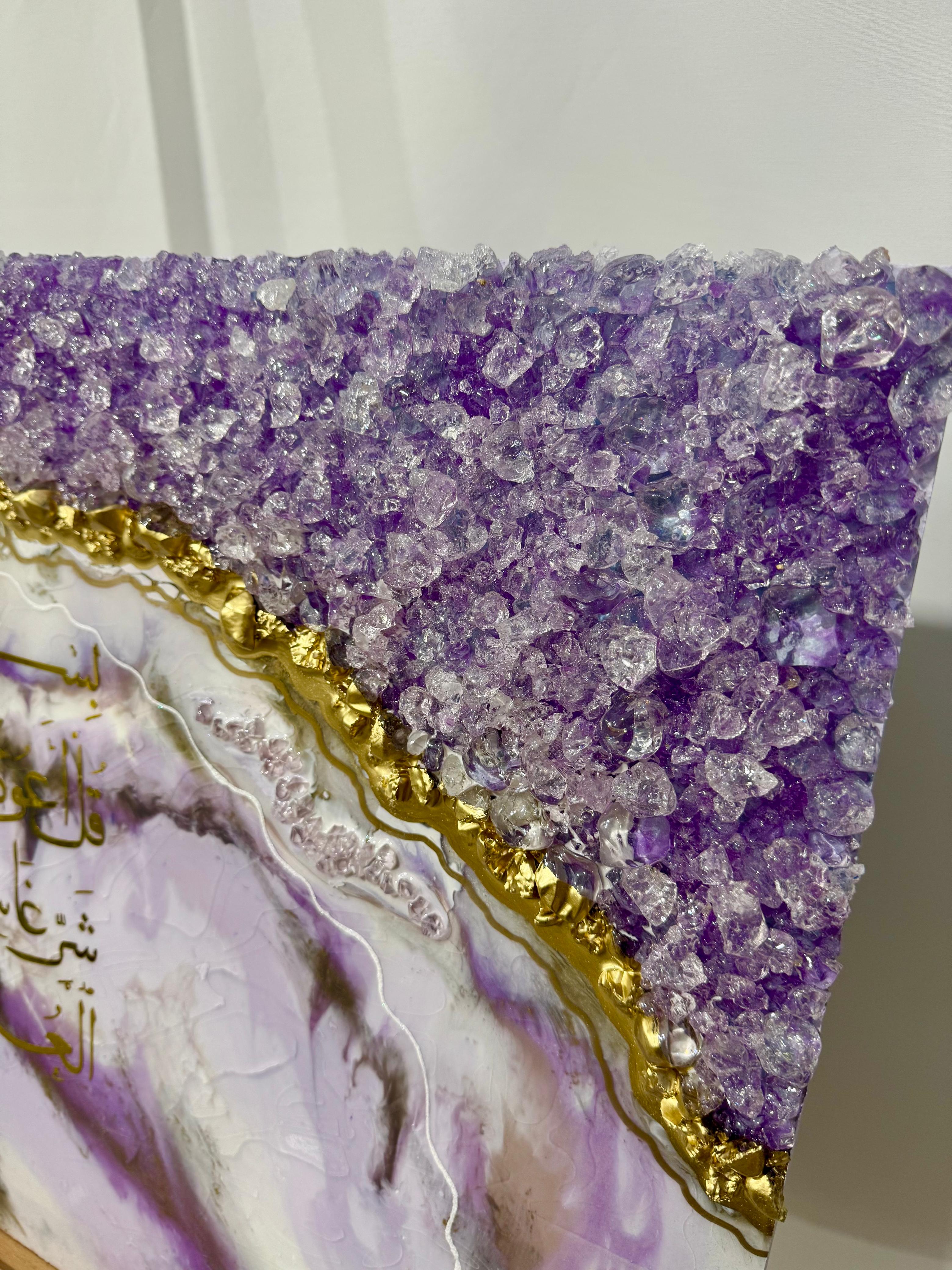 Une œuvre artisanale réalisée en résine de haute qualité, aux nuances violettes élégantes, sublimée par des cristaux transparents qui captent la lumière avec finesse.